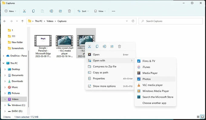 Right-click the video you want to extract the frame from, then choose "Open with > Photos" to play it in the Photos app.