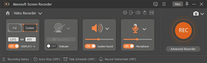 2. Once you do this, you will see all the settings for your video recording. You can specify the size of your recording by selecting "Full" or "Custom." During this step, you can also adjust your sound sources (Sound System & Microphone).
