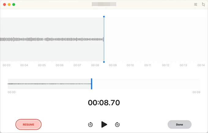 3. To pause the recording, click the Pause button at the bottom left. You can Resume the process whenever you want. The app supports for unlimited recording time which makes it easy to make a long audio recording on your MacBook.