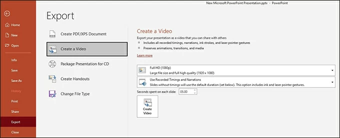 When you are done with PowerPoint presentations and you are satisfied with the recorded video and audio, then you can convert your PowerPoint presentations to a video and save it on your computer. Follow the below steps to make PowerPoint presentation video recordings with audio on Mac or Windows PC.