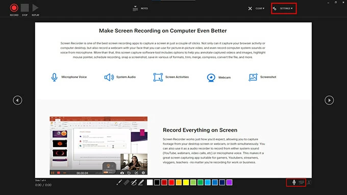Step 3. Adjust your video and audio parameters in the Settings option of the recording toolbar. The camera and microphone options are turned on by default.