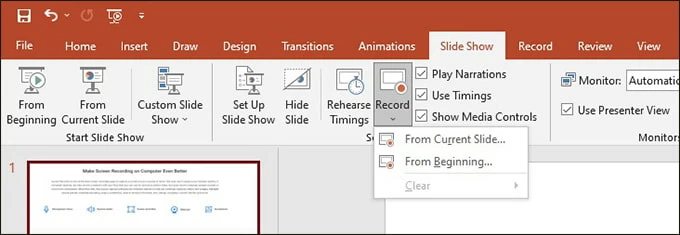 Step 2. Click Record Slide Show under the Slide Show box. And two options will be given, "Record from Beginning" and "Record from Current Slide."