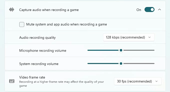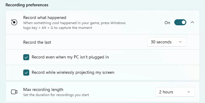 Configure one of the available screen recording options of Game Bar for whatever an app recording or a game recording in Settings > Gaming > Captures, including: