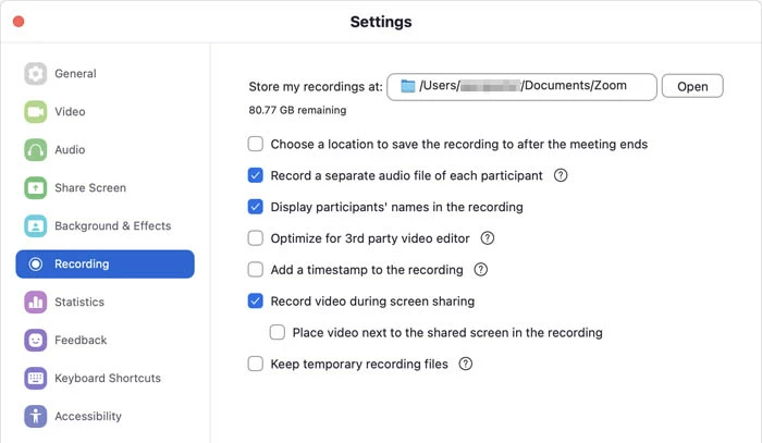 Open Zoom app on MacBook, click Home tab, choose Settings at the top right corner, and then select Recording from the left list.