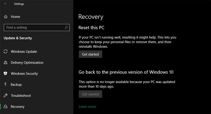 3. At the top of the window, click Get started under Reset this PC option.