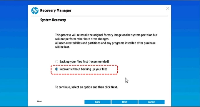 The unique advantage of using Recovery Manager to factory reset the HP laptop without a password is that it provides a backup window for saving user files before performing the system recovery. Here is how to reset HP laptop without password via HP Recovery Manager: