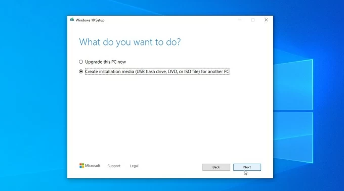 1. On another computer, download MediaCreationTool.exe from the Microsoft official website and install it. Launch the tool and select Create installation media (USB flash drive, DVD, or ISO file) for another PC.