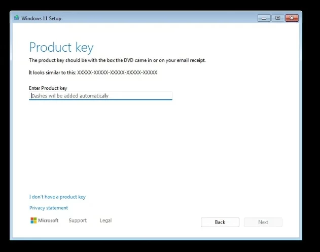 5. If you don't have a Product key, click the I don't have a product key link to continue.