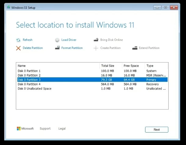 7. Choose your system drive, delete old partitions if needed, and click Next to start the installation.