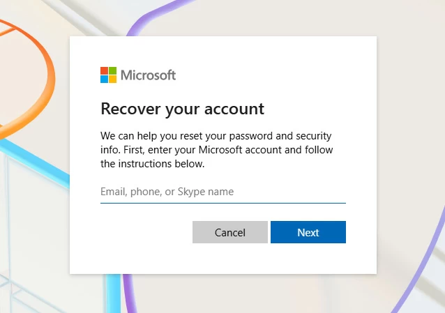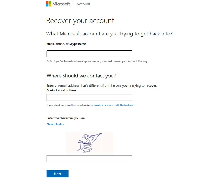 1. Enter the email address, phone number, or Skype name associated with the Microsoft account you're trying to recover.