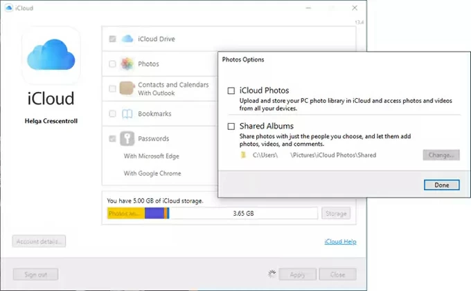 4. Select iCloud Photos, then Done, and then Apply. iCloud will create a separate folder on the PC to store your iCloud photos, and you can go to this default folder to view your iCloud photos.
