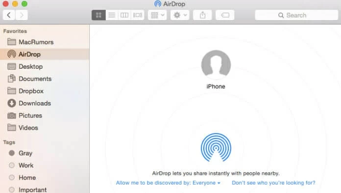 On your Mac: Move to "Finder" > "GO" > "AirDrop," then click on the "Allow me to be discovered by" option, you can choose to make your Mac discoverable to only "Contacts" or to "Everyone."