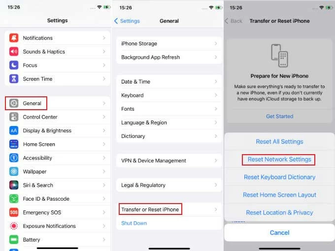 Step 1: Open the Settings app on your iPhone. Scroll down and tap on "General" > "Transfer or Reset iPhone" > "Reset" > "Reset Network Settings."