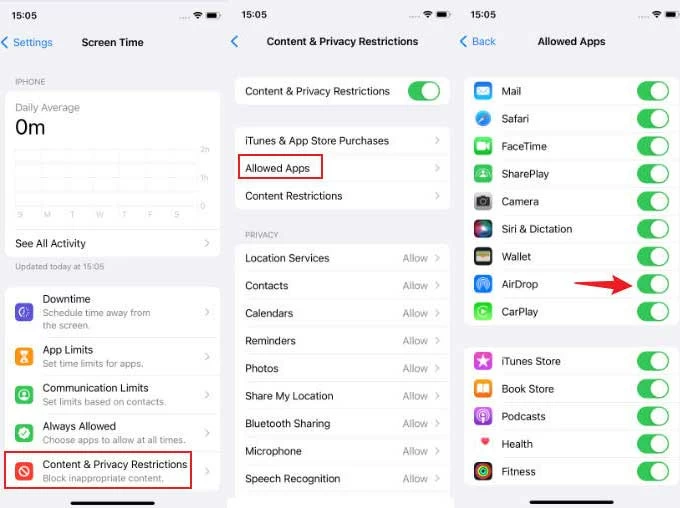 Apple allows users to set restrictions on any apps to limit or manage their use. If you previously disabled AirDrop restriction feature, this can cause AirDrop stuck on waiting. If so, you need to enable it.