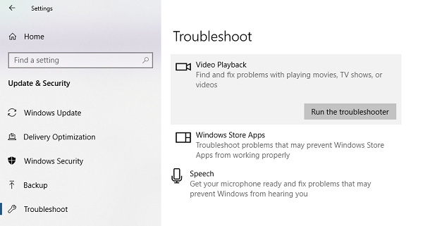 The first port of call if you find your Windows 10 won't play videos should always be the Video Playback troubleshooter of the Troubleshooting area.