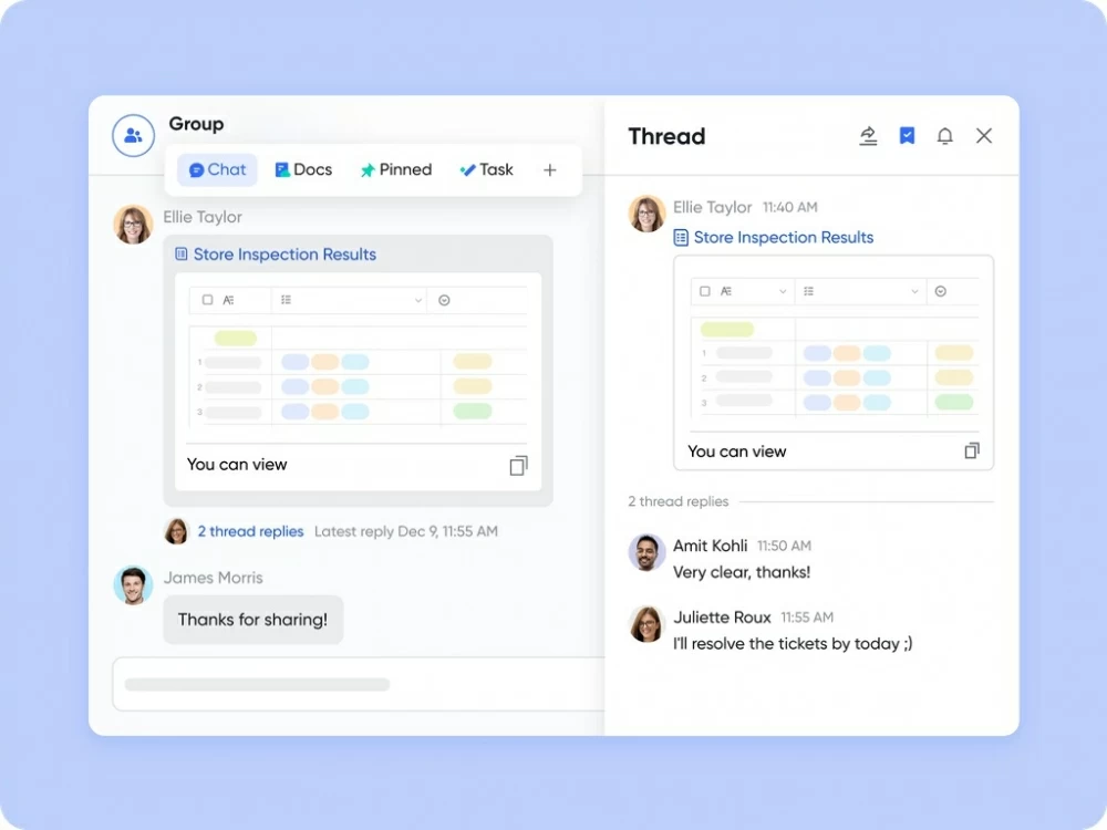 Pin key Docs or Base records in a chat. People joining midstream—like a new vendor—can catch up quickly and act with confidence.