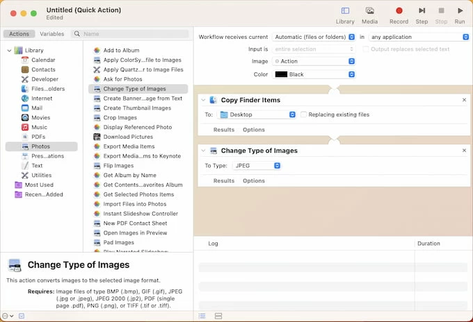 2. From the left sidebar named Library, choose Photos > Change Type of Images. When you double-click this option, there will be a window asking if you want to add this quick action. Click on Add to continue.
