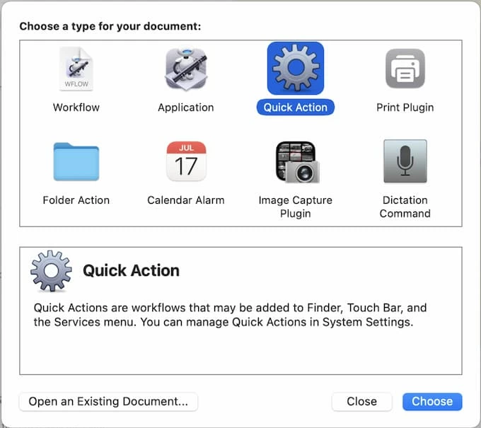 1. Open Automator and hit Quick Action from the category. Then click the blue Choose button.