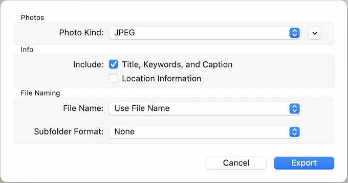 2. Select the images and click File > Export. Then, hit on Export [a number] Photos from the options.