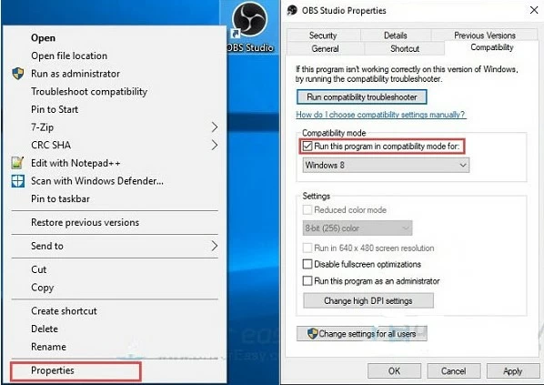 Another cause of OBS game capture not working properly might be the software being set in an incompatible operating system. If you don't enable it, there will be a barrier between OBS game capture and Windows. Here are the steps to authorize OBS to the compatibility mode.