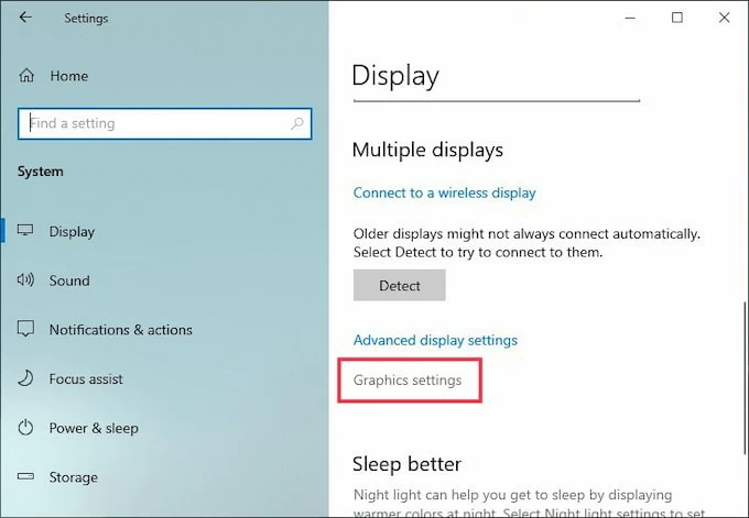 1. On Windows, hit the Start menu. Go to Settings, System, from the left side, click Display and then scroll down to select Graphics settings.