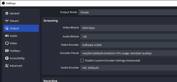 Incorrect encoding settings or excessive CPU usage due to high encoding settings can indirectly impact the recording audio features of OBS. Open OBS Studio and navigate to "Settings" > "Output" to set your Audio Bitrate to 128 and your Video Bitrate to 3500Kbps. You can select "Advanced" from the Output Mode channel to customize your OBS Rate Control. Finally, click "OK" to apply the settings.