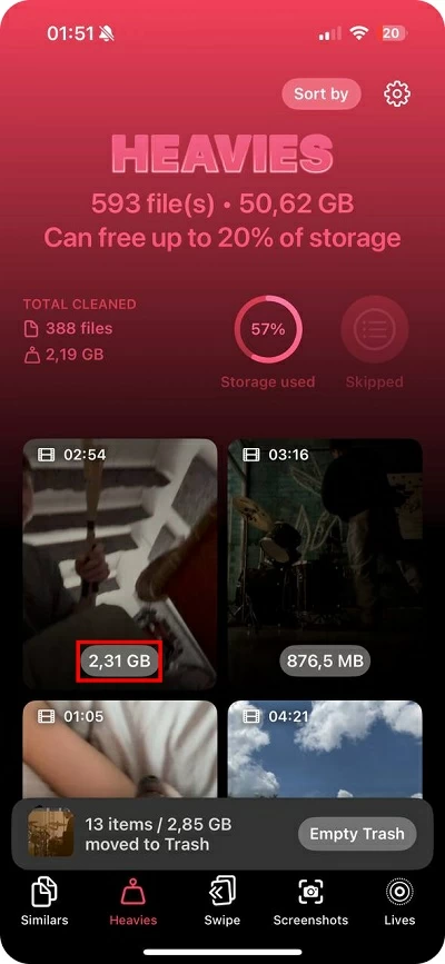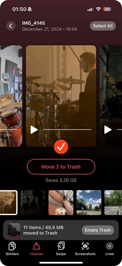 3. Once you finish with Similars, switch to Heavies. This section sorts photos and videos by file size, ideal for clearing oversized 4K clips or lengthy screen recordings that silently consume storage.