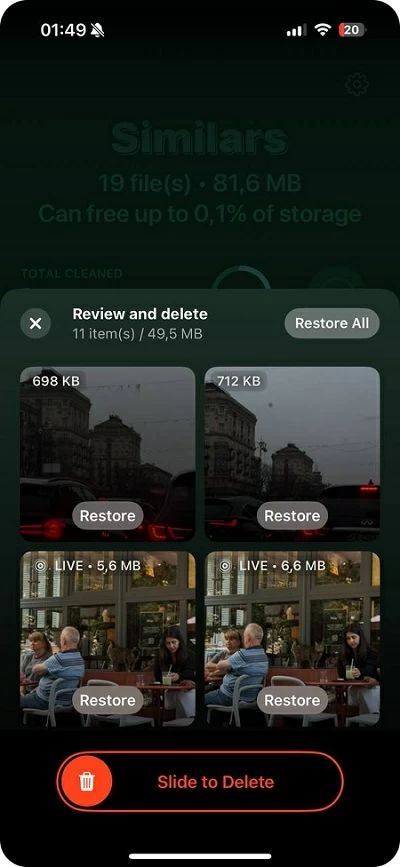 2. Tap Similars to reveal groups of near-duplicate photos. The app automatically marks the best version in each group, so you can delete the rest with a single swipe.