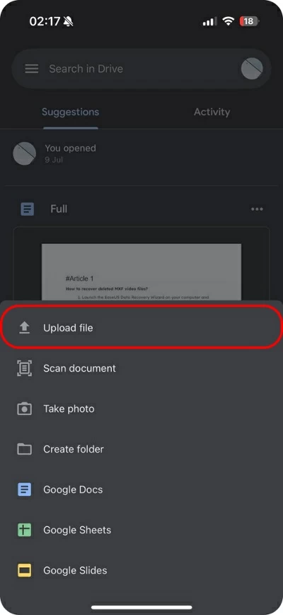 3. Tap the "+" icon, select Upload, then choose Photos and Videos.