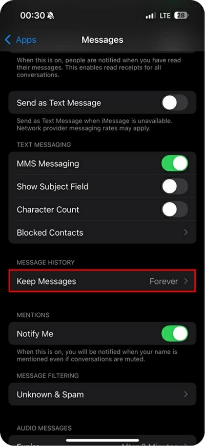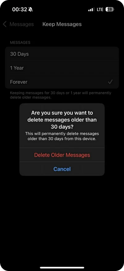 3. Confirm Delete Older Messages to erase conversations and attachments older than 30 days.