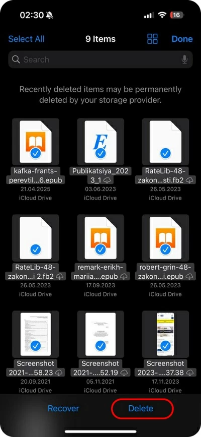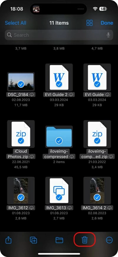 2. Tap Select, choose unneeded files, then tap the trash icon to erase them.