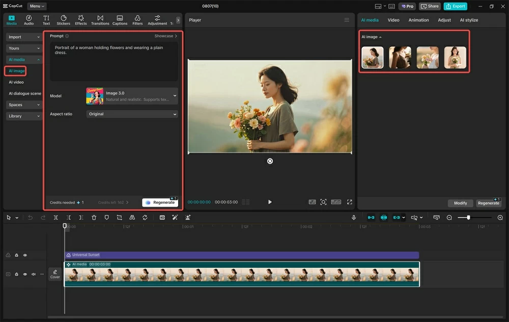 You do not need to utilize a camera or stock library to get these clips using CapCut Desktop Video Editor. Its AI image generator is capable of producing stock-type images that can be used as filler shots. This gives you pre-existing content to try out, test, and rehearse new edits.