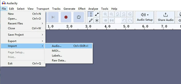 Launch Audacity on your computer and navigate to the File > Import > Audio to import your audio file in Audacity. Or you can create an audio recording in Audacity.