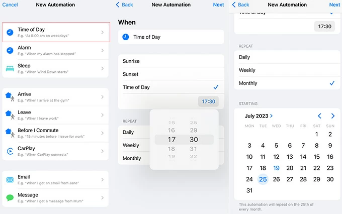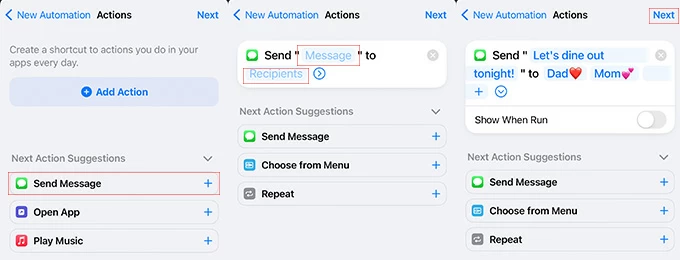 Step 4: Tap Next when time is set up, and then add the action Send Message.