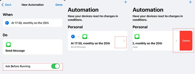 If you want to check the time or the content of the message before it will be sent, then you ought to turn Aske Before Running on and tap Done. Otherwise, you just turn it off and tap Done. Then, you are able to find your scheduled messages on Automation now.