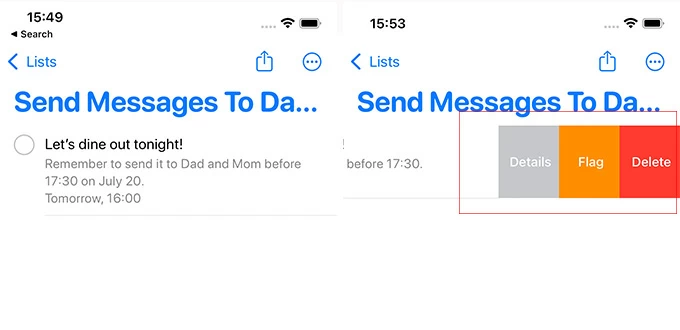 Then you can see the reminder of the text that you have scheduled on the screen. You can swipe it left to see Details, add Flag or Delete it.