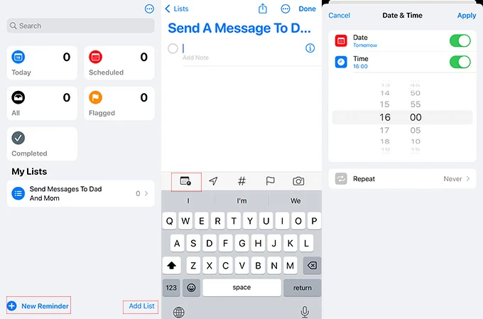 To use Reminders to schedule texts, you need to open Reminders > Add List in the bottom-right corner > tap +New Reminder and name it > type the content of the message > select the time you hope Reminders reminds you > Done.