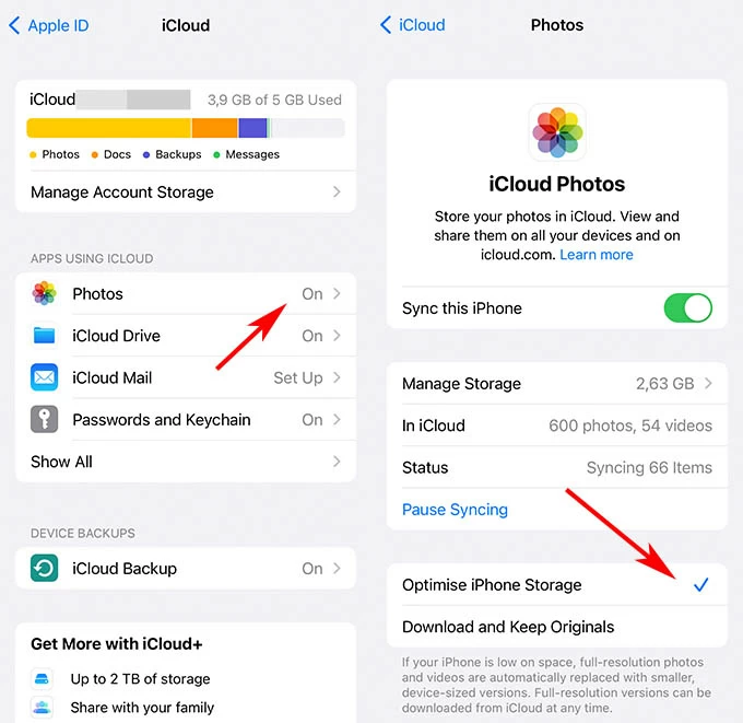 Tip: Once you tap Optimize iPhone Storage on iCloud, you are only able to view smaller and device-sized versions of your photos or videos in Photos on iPhone. If you want to see full-resolution photos, you can download it from iCloud.