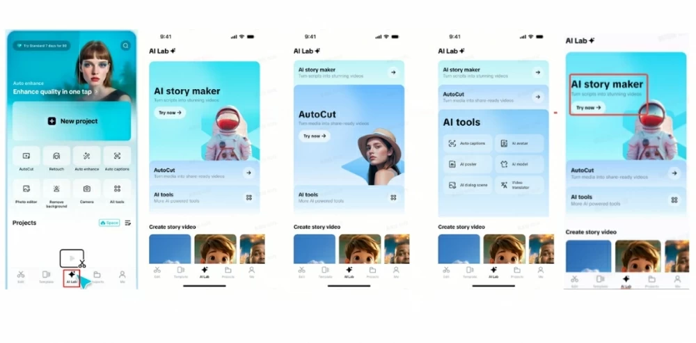 Start by opening CapCut and tapping the "AI Lab" from the bottom bar. Here, you'll find helpful tools including "AI story maker", "AutoCut", and other "AI tools". Select "AI story maker" and then press the "Try now" tab.
