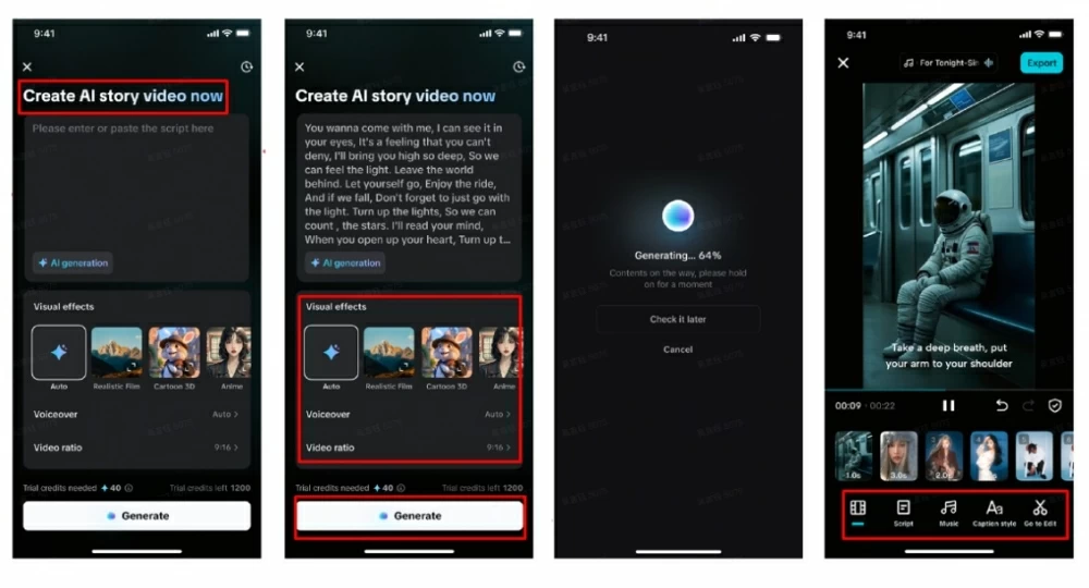 Paste your script or write a new one in the "Create AI story video now" box. Choose a visual theme such as Anime, Realistic Film, or Cartoon 3D. You can add a "Voiceover" and select the "Video ratio" that suits the audience. Tap "Generate" to continue.