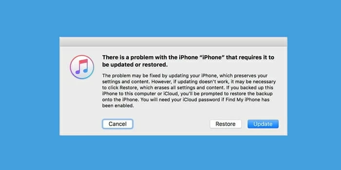 On your Mac or PC, Finder or iTunes will open automatically once it detects the phone in recovery mode. If not, launch it manually. A message pops up " There is a problem with the iPhone that needs to be updated or restored." with the option for Cancel, Restore and Update.