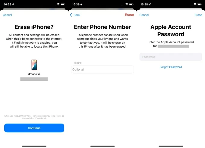 5. After verifying your Apple account password, tap Erase to trigger a reset on your unavailable iPhone.