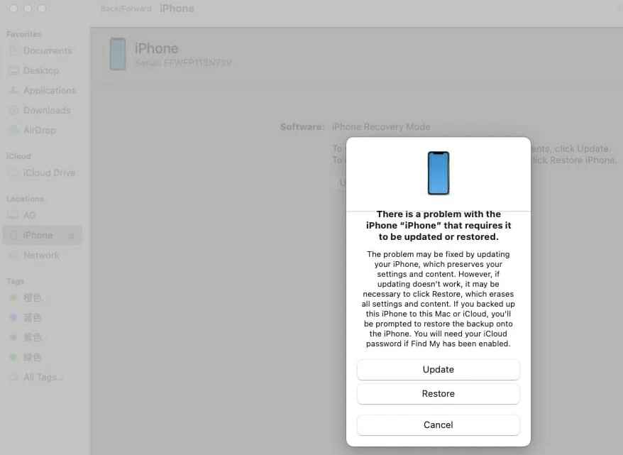 Now you're ready to reset iPhone XR via recovery mode. On iTunes or Finder window, a dialog window should be there. Choose Restore to get it to factory settings. When that's done, disconnect your phone and set it up. In the Apps & Data screen, it's time to use your most recent backup either from iCloud or Mac or PC to restore your data.