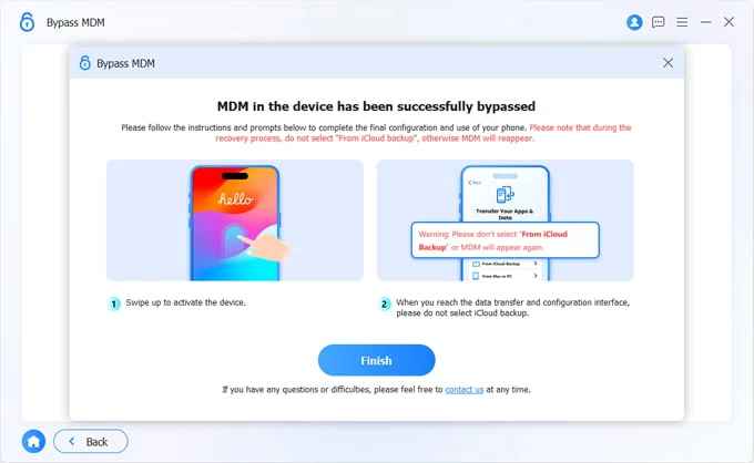One thing to be noted: during setup, avoid selecting "From iCloud Backup," which would result in an MDM locked screen again. But you can still use the software to remove it once more.