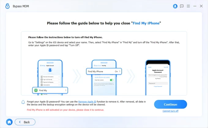 When everything is ready, click "Continue" button to begin the iPad MDM removal process.