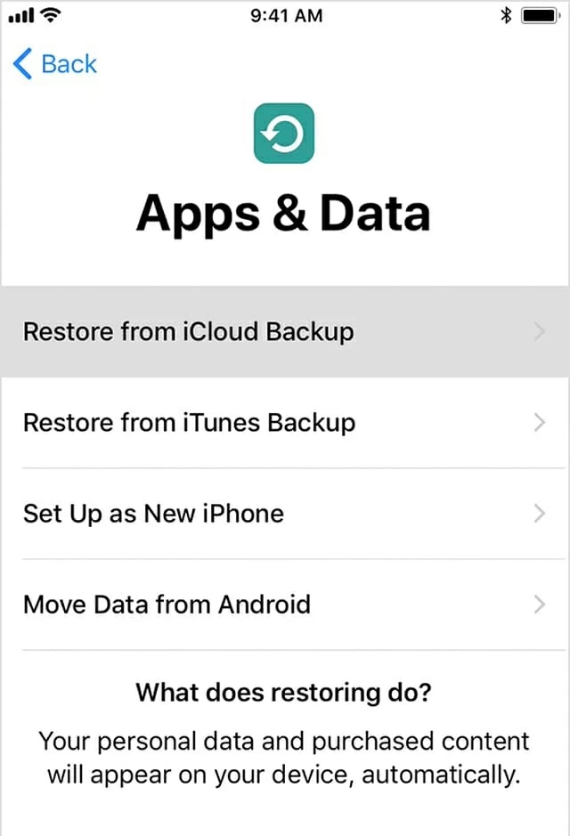 1. When you see App & Data screen, tap Restore from iCloud Backup. If your data are archived in iTunes, select Restore from iTunes Backup instead.