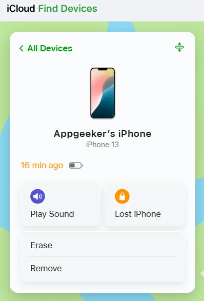 The icloud.com website shows the accurate location of your iPhone 16 on the map, as long as your phone has Apple account registered. It also lets you erase the phone when you realize that it's lost or stolen to protect your sensitive information. So when you forgot the passcode to unlock your iPhone 16, you can access iCloud, find your device, reset it completely, and the process is similar to how you factory reset the iPhone 16 through Settings app, but remotely.